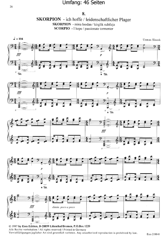 Zwölf Sternkreiszeichen (op.50), komponiert für Klavier. Mit einem umfangreichen Register von Komponisten und der Zuordnung, unter welchem Sternkreiszeichen diese geboren wurden. Eine vortreffliche Typisierung der unter den Sternbildern geborenen Charaktere. Urmas Sisask, in Estland lebend, ist Komponist und Astronom. Unsere modernen Sternbilder leiten sich aus einer Liste von 48 Figuren (heute einschl. des südlichen Sternenhimmels 88) ab, die schon um das Jahr 150 n.Chr. von dem griechischen Astronomen Ptolemaeus erstellt wurde. Viele dieser Bezeichnungen entstanden jedoch aus Konstellationen, die schon vor Jahrtausenden im östlichen Teil des Mittelmeeres geformt und von den Sternkundigen der alten Sumerer und Ägypter beobachtet wurden. Auf ihrem scheinbaren Lauf am Sternhimmel durchzieht die Sonne im Zeitraum eines Jahres 12 Sternbilder, die beiderseits Ihrer Bahn, der Ekliptik, liegen und von den Alten 'Zodiakus' oder auch der 'Tierkreis' genannt wurden. So durchläuft die Sonne scheinbar jeden Monat ein Sternbild dieser Reihe, gefolgt vom Mond und den Planeten, die sich auf der selben ekliptikalen Ebene bewegen und daher die gleichen Konstellationen des Himmels passieren. Die Stellung der Sonne und der Planeten innerhalb des Zodiakus bildet die Grundlage der Astrologie, d.h. 'die Kenntnis von der Wirkung der Sterne' auf das Geschehen im Leben der Menschen und ergibt so die Basis für die Erstellung von Horoskopen. Dieser zwölfteilige Klavierzyklus spiegelt die oben genannten Gesichtspunkte jedoch keineswegs wider, die Untertitel der einzelnen Stücke weisen nur darauf hin. So entstand der ganze Zyklus des estnischen Komponisten Urmas Sisask als das Ergebnis einer astrologischen Vision. Die 'Sternbilder' sind als Sammelband erschienen, jedoch auch in Einzelausgaben erschienen und eignen sich ganz besonders als kleine Aufmerksamkeit oder als Geschenk! (zu finden unter ERES2180-1 bis 2180-12 !Eres Estonia Edition