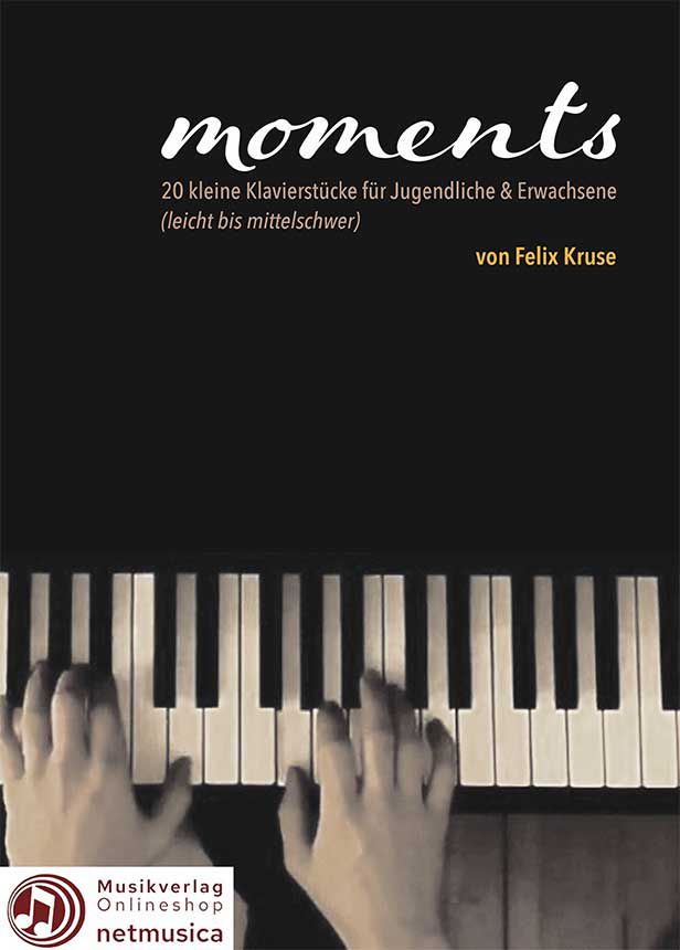 20 kleine Klavierstücke für Jugendliche & Erwachsene. Die "moments” sind kleine, detailverliebte Momentaufnahmen aus dem menschlichen Dasein. Du findest hier 20 kurze Charakterstücke, die verschiedenste Stimmungen zum Ausdruck bringen und zugleich verschiedene spieltechnische Herausforderungen bieten. Einaudi und Philip Glass, Chilly Gonzales und Astor Piazzolla, aber auch Ragtime und Pop haben ihre Spuren hinterlassen – der Stil bewegt sich zwischen "Klassik", traditionellem Jazz, Welt- und Avantgardemusik, die Schwierigkeit zwischen leicht und mittelschwer. Einige moments findest Du auch auf Felix Kruses YouTube-Kanal "easy piano & cetera".
