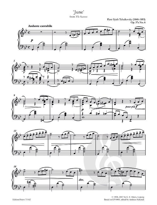 P. I. Tschaikowsky ‘June' from 'The Seasons' includes the printed score, a written masterclass from international concert pianist Daniel Grimwood, in which he describes how to approach the barcarolle style of this Romantic Russian piano music, a biography of the composer and a short history of the music - all illustrated in full colour.