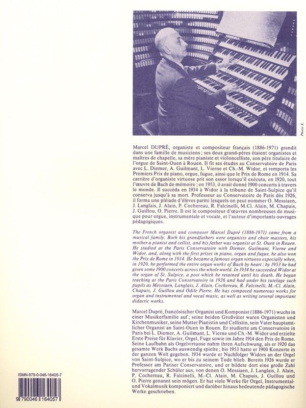 Written for upper-advanced organ players, Three Preludes and Fugues is a work by Marcel Dupré. Dedicated to René Vierne, this Op. 7 uses complex figurations and pedals. With such challenging difficulty, the first and thirdpreludes were pronounced'unplayable by Charles-Marie Widor due to their fast tempo, their figurations and the pedal chords. For a long time, Dupré himself was the only one able to play them. Marcel Dupré is a French organist whoreviewed some works by J. S. Bach, including The little Organ Book. He composed numerous pieces such as Lamento, Scherzo and Titelooze Tombstone, among others.