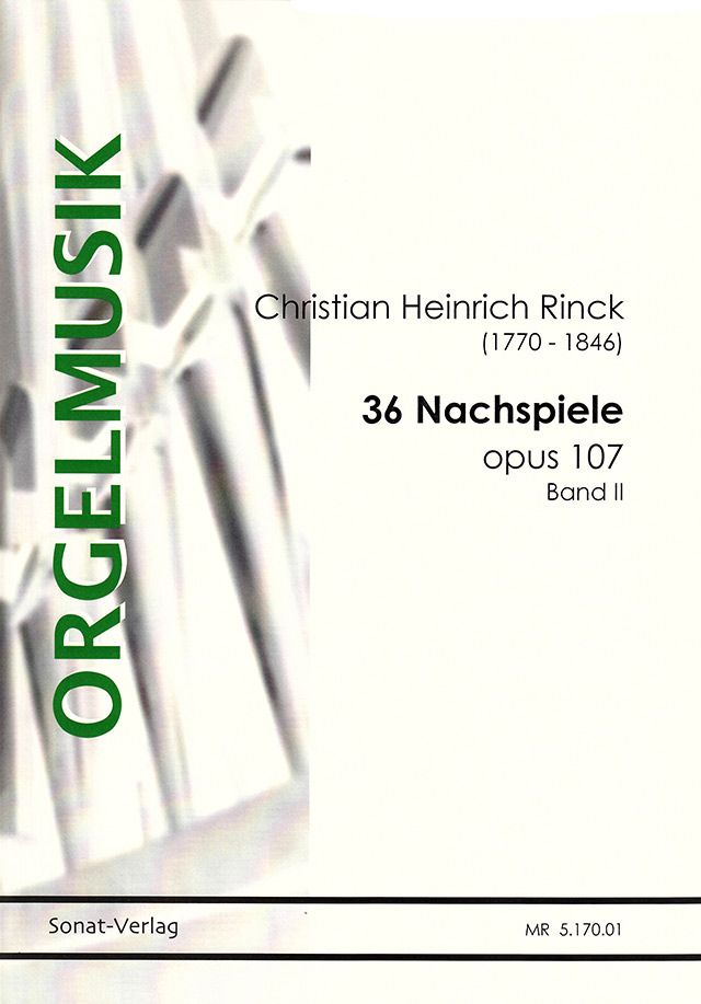 Die 36 Nachspiele erschienen 1833 als opus 107 erstmals bei Bädecker in Essen und stellen eine Zusammenschau der großen Orgelkunst Rincks dar. Kurze, leichte Sätze sind ebenso enthalten wie groß angelegte, virtuose Präludien, festliche Einzugsmusiken ebenso wie verspielte kleine Fugen.