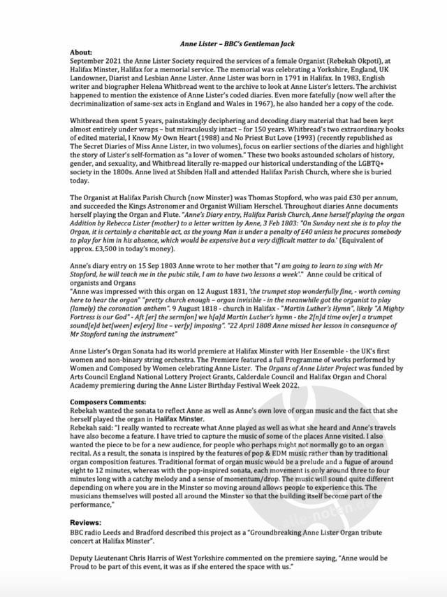 We are delighted to add this unusual and intriguing 5-movement piece by emerging young female composer, Rebekah Okpoti (who you may know as 'the girly organist'), to our catalogue. The piece was inspired by Anne Lister (aka 'Gentleman Jack'), who's life was dramatised in a television series filmed around her hometown of Halifax and other locations in Yorkshire. You can read all about the piece and each movement in the notes pages which we have pictured. The piece was premiered to great reviews where Anne Lister used to play at Halifax Minster. Each movement can also be played separately and would be suitable for services or concert fillers, particularly movements 2 and 4.