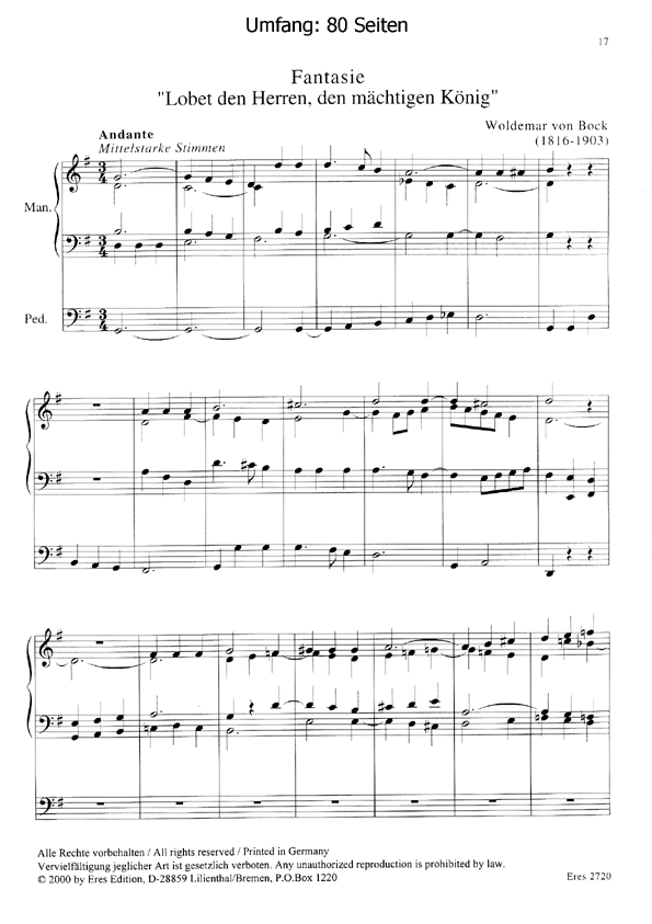 Bisher nur schwer zugängliche Orgelkompositionen aus dem baltischen Raum, die für die Entwicklungsgeschichte der Orgelkultur der Staaten Estland, Lettland und Litauen von Bedeutung sind.Die Gliederung des Heftes orientiert sich an den Ländergrenzen, der Schwierigkeitsgrad übersteigt V-Niveau nicht.(Sammelband) Estland / Estonia J.F. La Trobe Wer nur den lieben Gott (3 Choralvorspiele)- Allein Gott in Höh (2 Choralvorspiele)- Zwei Fughetten (B-Dur, c-moll)Wold.von Bock Fantasie 'Lobet den Herren, den mächtigen...'Peeter Laaja Präludium im estnischen StilLettland / LatviaG.M.Telemann Straf mich nicht in deinem Zorn (2 Choralvorspiele)A. Ore Konzertsatz d-moll (Op.36,1)J. Vitols PastoraleLitauen / LithuaniaJ. Naujalis Malda (Prière)M.K. Ciurlionis Fuga cis-mollEres Estonia EditionMusik aus LettlandMusik aus Litauen