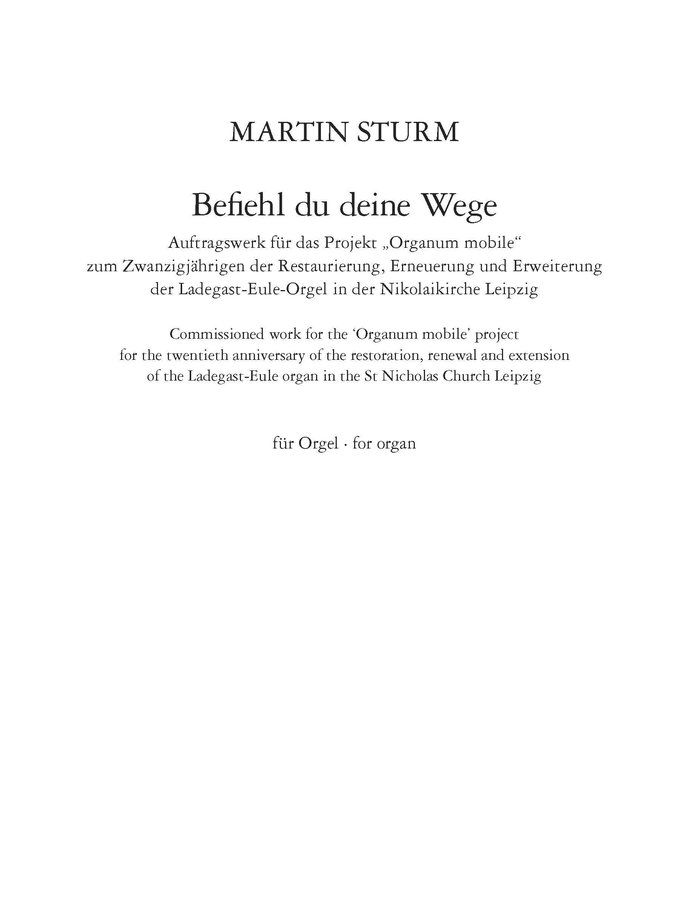 Befiehl du deine Wege, composed by Martin Sturm for organ solo in digital sheet music format. Commissioned work for the ‘Organum mobile’ project for the twentieth anniversary of the restoration, renewal and extension of the Ladegast-Eule organ in the St Nicholas Church Leipzig.