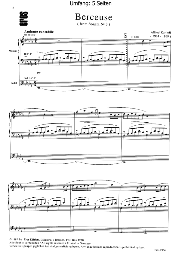 Die 'Berceuse' ist der 2. Satz der 1944 entstandenen Orgelsonate Nr. 3 und besonders beliebt und ragt aus dem bedeutenden Orgelaschaffen Karindis hervor. Auff.-Dauer: 5'40. (III)Eres Estonia Edition