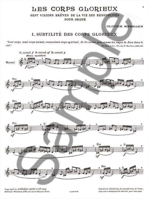 The Glorious Bodies, by Olivier Messiaen is a composition that exhibits his Roman Catholic faith. Written for organ in 1939, it is a mix between Indian music and Gregorian Plainsong. This first volume includes the first threepieces of the whole composition: 1. Subtilité des Corps Glorieux, 2. Les eaux de la Gr ce and 3. L'ange aux parfums. This piece is divided in 7 sections: 1. Subtilité des Corps Glorieux 2. Les eaux de la Gr ce 3. L'ange auxparfums 4. Combat de Mort et de la Vie 5. Force et agilité des Corps Glorieux 6. Joie et clarté des Corps Glorieux 7. Le Mystère de la Sainte-Trinité. Olivier Messiaen (1908-1992) was a French organist and composer passionateabout ornithology and one of the most important composers of his century. Inspired by Japanese music, he had a very special way of composing and his work can be identified by its complexity, its diatonic aspect, its harmony withlimited transposition, its colour and its additive rhythms. He composed many works related to ornithology and birdsong, including the Bird Catalogue in 7 volumes and the Treatise on Rhythm, Colour and Ornithology in 7 volumes.