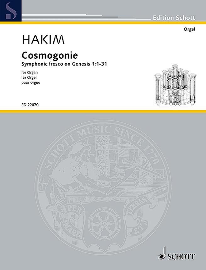 Cosmogonie wurde nach einer Improvisation des Komponisten beim Haarlem Internationalen Orgel-Improvisationswettbewerb, Rotterdam 1981 geschrieben. Das gegebene Thema war eine abstrakte Graphik des Künstlers Enrique Raxach. Die Komposition ruft die Eröffnungsverse des alttestamentarischen Buches Genesis in Erinnerung.