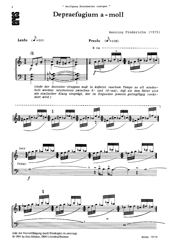 Das Stück ist eine 'Toccata' nach J.S.Bach's 'Praeludium und Fuge in a-moll' (BWV 543) und experimentiert mit 'stehenden' (gleichwohl so schnell wie möglich bewegten) Klangflächen, die sich unmerklich verändern.Der Auslöser war die bei Bach ganz zum Schluss erklingende Sextole, die tonartlich nicht eindeutig erfassbar ist.Schwierigkeitsgrad V