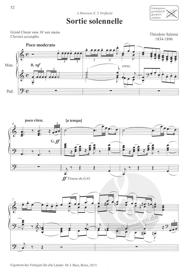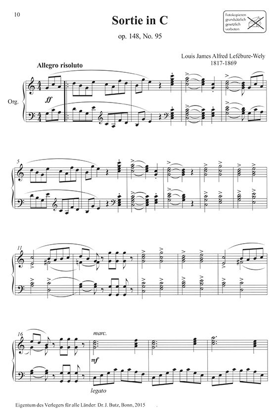 Bei Nennung der Werkbezeichnung 'Sortie' schlagen die Herzen der meisten Organisten/innen rasch höher, handelt es sich doch zumeist um festliche, mitunter pompöse Auszugsmusik (es darf ja auch mal ein 'Rausschmeißer' sein... ), bei der der Spieler noch einmal (neben dem 'Entrée') richtig glänzen kann. Aus dem großen Fundus an Sorties der französischen Romantik wurden für diesen Band die schönsten ausgewählt. Allerdings wurde - unter Auslassung der allseits bekannten und bereits vorhandenen Werke - der Schwerpunkt auf vergessene und vergriffene Stücke gelegt, um eine möglichst große Repertoireerweiterung zu erzielen. Und siehe da: Nicht alle Werke sind pompöser Natur, einige lassen sich sogar vielfältig zu anderen Gelegenheiten einsetzen. Ein stattlicher Sammelband von hohem Praxiswert!
