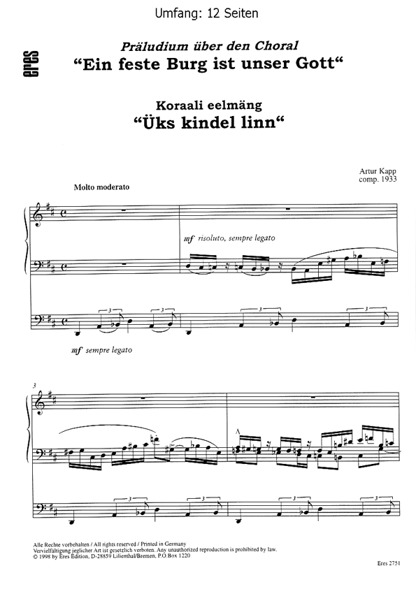 Fantasie über den Choral (komponiert 1932) Auff.-Dauer: 4'50 min (V).Eres Estonia Edition