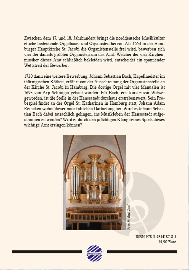 1720 dann eine weitere Bewerbung: Johann Sebastian Bach, Kapellmeister im thüringischen Köthen, erfährt von der Ausschreibung der Organistenstelle an der Kirche St. Jacobi in Hamburg. Die dortige Orgel mit vier Manualen ist 1693 von Arp Schnitger gebaut worden. für Bach, erst kurz zuvor Witwer geworden, ist die Stelle in der Hansestadt durchaus erstrebenswert. Sein Probespiel findet an der Orgel St. Katharinen in Hamburg statt, Johann Adam Reincken wohnt dieser musikalischen Darbietung bei. Wird es Johann Sebastian Bach dabei tatsächlich gelingen, ins Musikleben der Hansestadt aufgenommen zu werden? Wird er durch den prächtigen Klang seines Spiels dieses wichtige Amt erringen können?