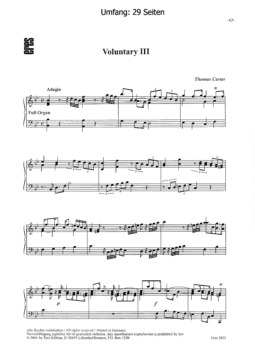 Herausgeber: Wolfgang Lindner Voluntary I bis IVDieser irische Komponist wuchs als Chorknabe der Christ Church Cathedral in Dublin auf. Schon mit 16 Jahren wirkte er in seiner Heimatstadt als Organist der St.Werburgh-Kirche und behielt diesen Posten inne, bis die Orgel im Jahre 1754 einem Feuer zum Opfer fiel. Nach Wiedererrichtung einer Orgel nahm er sein Amt als Organist hier im Jahre 1767 wieder auf, nachdem er zwischenzeitlich als Organist der St.Peter's Church (1757-1763) gewirkt hatte. im Jahre 1769 verliess er Irland, um sich in London einer Theaterkarriere zu widmen. Offensichtlich verlief diese nicht wie erhofft, denn aus seiner Londoner Zeit ist ein Bewerbungsgesuch für St.George's, Windsor, erhalten, das aber negativ beschieden wurde. Als Komponist hinterliess er Lieder, Bühnenmusiken, eine komische Oper und Sonaten für Tasteninstrumente. Die hier vorgelegten Werke stellen eine echte Bereicherung der nicht gerade geringen Orgelliteratur dar. Sie erschienen um 1800 erstmals bei A. Hamilton in London.