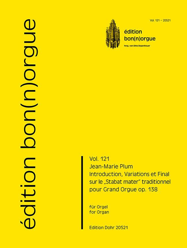 Das 'Stabat mater dolorosa' hat auf Plum Zeit seines Lebens einen starken Eindruck gemacht. Immer wieder wandte er sich der musikalischen Verarbeitung des gregorianischen Hymnus zu: in Opus 114 (1934) für drei gleiche Stimmen und Orgel, in Opus 141 (1936), einem Sammelalbum gregorianischer Melodien für Orgel, in Opus 192 (1943) für vierstimmigen gemischten Chor und Orgel sowie in dem als Opus 138 erschienenen 'Introduction, Variations et Final' für Orgel. Der Erstdruck erfolgte 1938 in der Edition Cranz (Brüssel). Der kleine, technisch nicht allzu anspruchsvolle Variationszyklus stellt in seiner Einleitung die einzelnen Phrasen der gregorianischen Melodie vor, konzentriert sich im Übrigen auf die bekannte Eingangsphrase, um im Finale erneut den gesamten Hymnus musikalisch einzubinden. (Otto Depenheuer)