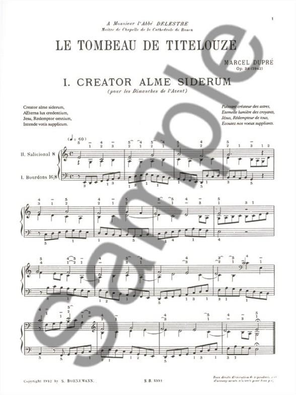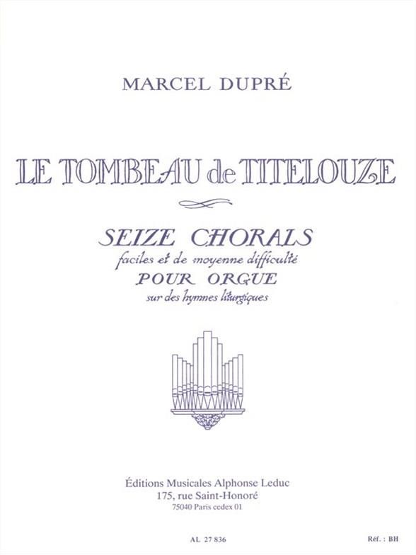 Composed in 1942, Titelouze's tombstone by Marcel Dupré is a set of sixteen chorals for Organ. Based on liturgical rhythms, these chorals are rated easy and medium in term of difficulty. This musical memorial to Jehan Titelouze, an organist who lived at the period of the Spanish Armada (16th century), is a pedagogical work with melody mainly based on Gregorian music. These sixteen studies, all very different and very progressive are: 1. Creator Alme Siderum (3 voices manuals only) 2. Jesu Redemptor Omnium (3 voices manuals only) 3. A solis Ortus Cardine (3 voices) 4. Audi Benigne Conditor (3 voice) 5. Te Lucis Ante Terminum (4 voices) 6. Coelestis Urbs Jerusalem (4voices) 7. As Regias Agni Dapes (4 voices) 8. Veni Creator Spiritus (4 voices) 9. Vexilla Regis (4 voices) 10. Pange Lingua (3 voices) 11. Ave Maris Stella (4 voices) 12. Iste Confessor (4 voices) 13. Lucis Creator Optime (4 voices) 14. Ut Queant Laxis (5 voices) 15. Te Splendor et Virtus (5 voices) 16. Placare Christe Servullis (Toccata) Each choral of this set is really colourful and can be considered a masterpiece.