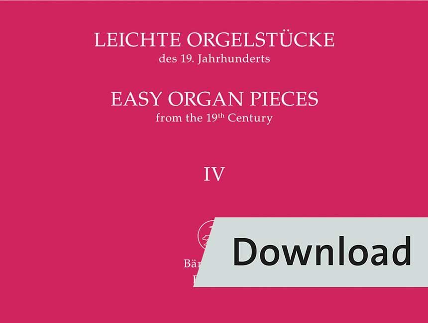 Leichte Orgelstücke des 19. Jahrhunderts bietet nebenberuflichen Organisten eine Sammlung kurzer, nicht choralgebundener Orgelstücke für ein- und zweimanualige Instrumente. Anders als in den drei vorhergehenden Bänden ist Band IV nicht nach Tonarten, sondern nach Komponisten geordnet. Die drei hier vertretenen Komponisten sind biographisch miteinander verbunden.