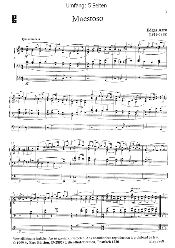 Eine von Optimismus erfüllte und in Form und Bildhaftigkeit helle Komposition, das wohl beste Werk für Orgel von Edgar Arro, das er 1943 komponierte.Eres Estonia Edition