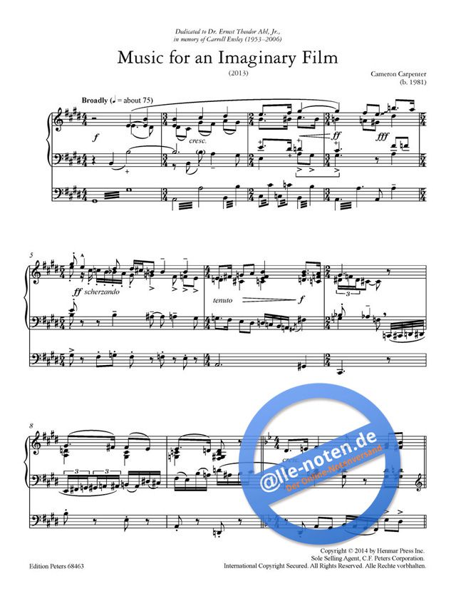 A virtuoso, eight-minute piece for solo organ, Music for an Imaginary Film, is featured on Cameron Carpenter's forthcoming CD If You Could Read My Mind (Sony Classical). Although conceived for Carpenter's new International Touring Organ (built for him by Marshall & Ogletree), the work has been edited to make it playable on any reasonably flexible three-manual organ.