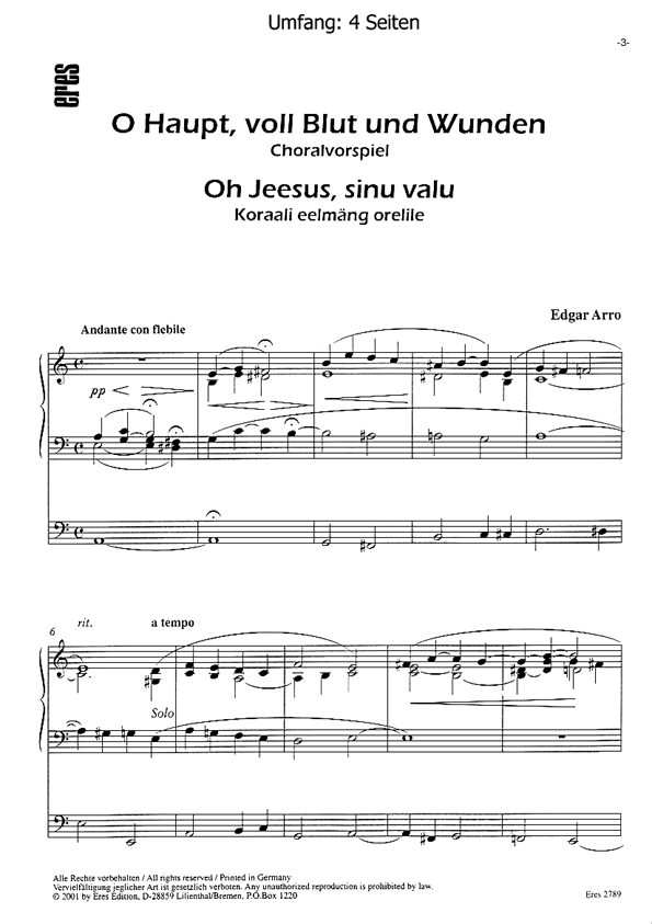 Mit seinem klassischen Klang ist dieses Choralvorspiel eines seiner exponiertesten Werke.Auff.-Dauer: 3'40 min.Eres Estonia Edition