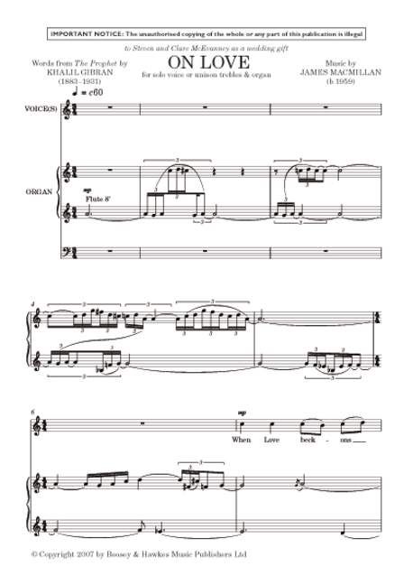 On Love ist die Vertonung einer Passage aus Khalil Gibrans 'Der Prophet' aus dem Jahr 1984. Die kraftvollen Bilder des Textes hat MacMillan durch Musik zum Leben erweckt. Mittlerer Schwierigkeitsgrad.