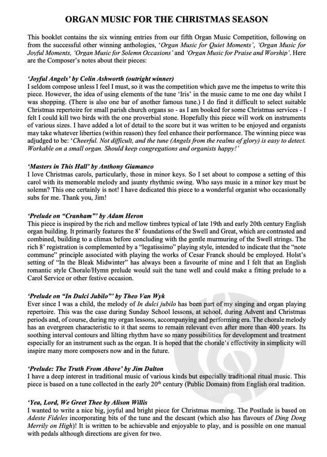 Following our very successful previous competitions we were delighted to receive a great many entries from around the world for our fifth competition on the theme of 'Organ Music for the Christmas Season'. The criteria was the same: to write a piece no more than 3 minutes long which must be suitable for an Organist of moderate standard and for use in a Church setting primarily, but could also be suitable for a concert or recital setting. This booklet contains the top six winning entries and the outright winner by Colin Ashworth, 'Joyful Angels'. You can read more about the winning entries and composers via our bloghttps://www.timknightmusic.com/post/hark-herald-our-angelic-winner Contents:1. Joyful Angels - Colin Ashworth (competition winner)2. Masters in This Hall - Anthony Giamanco3. Prelude on 'Cranham' - Adam Heron4. Prelude on 'In Dulci Jubilo' - Theo Van Wyk5. Prelude: The Truth from Above - Jim Dalton6. Yea, Lord, We Greet Thee - Alison Willis