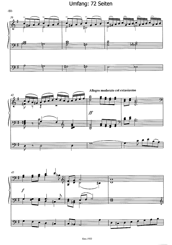 Juhan Aaviks Orgelsonate op. 114 entstand 1950/61 in Bergsbrunna / Schweden. Die enorme Länge des Werkes (782 Takte) stellt die funktionelle Harmonik mit ihren Modulationstechniken und chromatischen Alterationsmöglichkeiten das wesentliche gestalterische Element dar. Damit vereinigt der Komponist sein Themenmaterial - estnische Volksweisen -, zum großen Teil von ihm selbst komponiert auf patriotische Texte - in sehr gewandter Satztechnik zu einer grossangelegten Sonatenform. Die Orgelsonate J. Aaviks ist - wie sein gesamtes Oeuvre überhaupt - eine Hommage an die Heimat Estland, wie ab Seite 73 zitierten Themen belegen mögen. Eres Estonia Edition