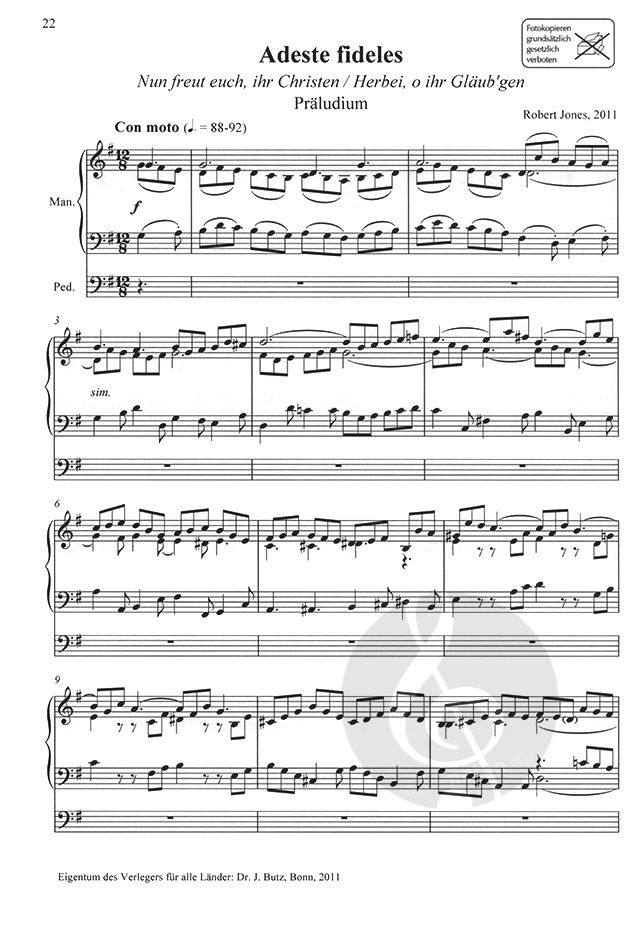 Tambourin, Flötenuhrstück, Berceuse, Carillon, Meditation, Toccatina, Sortie ... diese Satzbezeichnungen sind jedem Organisten vertraut. Wenn sie jedoch in einer Sammlung mit Choralvorspielen zu Advents- und Weihnachtliedern erscheinen, horcht man unwillkürlich auf. Und wenn auf dem Umschlag dieser Edition der Name des bei uns hoch geschätzten Robert Jones steht, dann darf man zu Recht gespannt sein und sich auf einige vergnügliche Preziosen freuen, die einige der bekanntesten Lieder des Festkreises in ein neues Licht setzen. 14 leicht bis höchstens mittelschwer zu spielende Choralvorspiele im englischen Klanggewand!