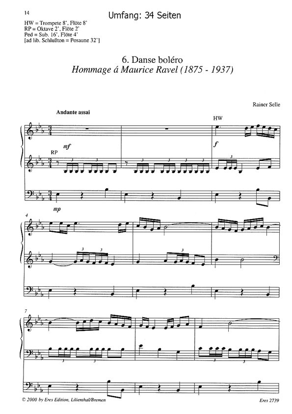 Komponiert im Stile französischer Komponisten Inhalt: 1. Introduction (M. Panonaud, 1893-1921) 2. Lent (Ch.-C. Saint-Saëns, 1835-1921) 3. Trio (M. Dupré, 1886-1971) 4. Piéce cromatique (M. Duruflé, 1902-1986) 5. Scherzo (J. Bonnet, 1884-1944) 6. Danse boléro (M. Ravel, 1875-1937) 7. Gymnopédie (E.Satië, 1866-1925) 8. Choral (C.Franck, 1822-1890) 9. Ménuett gothique (L.Boëlmann, 1862-1897)10. Marche (L.J.A.Lefébure-Wély, 1817-1869)11. Meditation (O. Messiaen, 1908-1992) 12. Toccata (L. Vierne, 1870-1937) Zwölf Sätze hat die Partita, jede eine Hommage an einen französischen Komponisten des 19. oder 20. Jahrhunderts. Dabei werden vor allem typische Orgelkomponisten geehrt (siehe oben), aber auch Musiker, die man eher aus anderem Zusammenhang kennt. Die Titel sind gleichzeitig Programm. Selle hält sich in vielen Sätzen sehr eng an die Choralvorlage, was dem Hörer das eine oder andere schöne Aha-Erlebnis verschafft.Eine Ausgabe, dessen Aufführung lohnenswert ist. Die Variationen werden Spielende (leicht bis mittelschwer) und Hörende erfreuen.