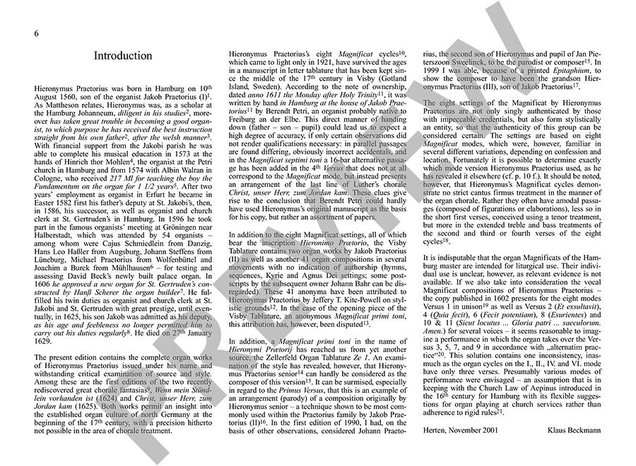 Hieronymus Praetorius (1560-1629) ist einer der Gründerväter der Orgelmusik im Protestantismus Norddeutschlands. Die Neuausgabe vereinigt erstmals die getrennt überlieferten Choralmelodien (Cantiones sacrae, Hamburg 1587) und die dazugehörigen Orgelstücke (Tabulatur Visby, 1611). Die frühbarocken Stücke sind sowohl in der Liturgie (Alter-native-Praxis) als auch im Konzert (ohne Choralschola) ausführbar.