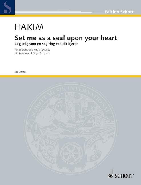 Naji Hakim, geboren 1955 in Beirut, gehört zu den bedeutendsten Organisten und Orgelkomponisten der Gegenwart. Er studierte bei Jean Langlais sowie am am Conservatoire in Paris und war von 1985-93 Organist an Sacré-Coeur in Paris, anschließend als Nachfolger Messiaens an der Basilika SteTrinité. Er konzertiert weltweit, wirkt als Professor am Conservatoire in Boulogne und hat eine Gastprofessur an der Royal Academy in London.Set me as a seal upon your heart vertont einen der bekanntesten Texte aus dem Hohelied König Salomons. Die ausdrucksstarke Arie für Sopran und Orgel eignet sich für geistliche und weltliche Konzerte. Hakim komponierte dasselbe Stück auch in einer Version für gemischten Chor a cappella (C 53747).