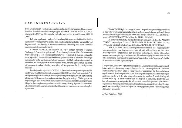 Organist Eva Feldbc:ek had been asking me for a long time to write for the organ without the use of iron blocks, extra stopping assistants etc... unusual difficulties that belonged to my earlier organ music. I setmyselfthe task of Miting a ''handier'' kind of music for the organ.