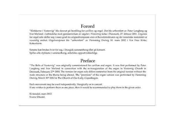Preface: 'The Bells of Vestervig' was originally commissioned for carillon and organ. It was first performed by Peter Langberg and Ivar M'land in connection with the re-inauguration of the organ in Vestervig Church in Denmark, February 27th 2011. The version for organ solo differs somewhat from the original version without the main structure or the theme being altered. The 'premiere' of the organ version was performed by Flemming Dreisig, March 10th 2012 in The Church of Our Lady, Copenhagen. Each movement may be used independently, liturgically or in concert. If one wishes to perform them as one piece, then it would be recommended to play them in the given order. Kvinesdal, mars 2012; Sverre Eftestol.