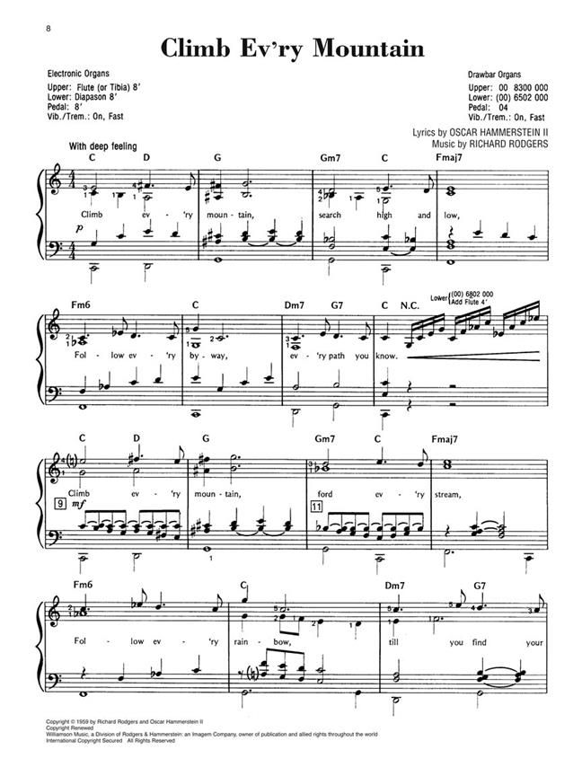 A great souvenir collection featuring organ arrangements of six songs from the beloved Rodgers & Hammerstein masterpiece as well as photos, story synopsis and history of the musical. Includes: Climb Ev'ry Mountain - Do-Re-Mi - Edelweiss - My Favorite Things - Sixteen Going on Seventeen - The Sound of Music.