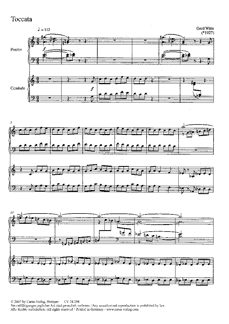 Die Toccata ist als klanglicher Disput gedacht. Die Disputanten sind Orgelpositiv und zweimanualiges Cembalo. Diese Kombination schliesst die Verwendung einer grösseren Orgel nicht aus. Das klangliche Gleichgewicht sollte aber gewahrt bleiben. - Org, Cemb