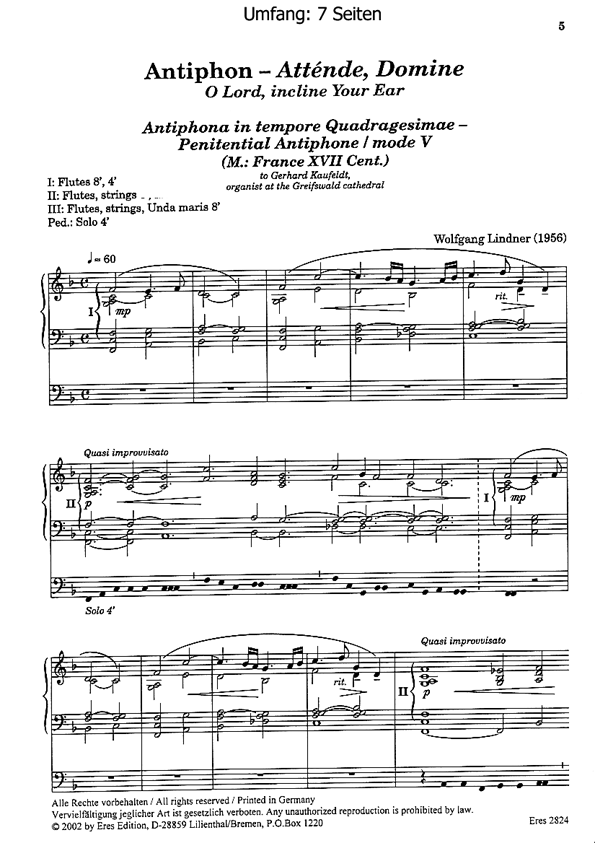 Communion - Agnus DieAntiphon -Atténde, DomineÜber die Musik Wolfgang Lindners finden Sie weitere Ausführungen im Zusammenhang mit seiner von Wolfgang Baumgratz eingespielten Orgel-CD (eres-CD 31).
