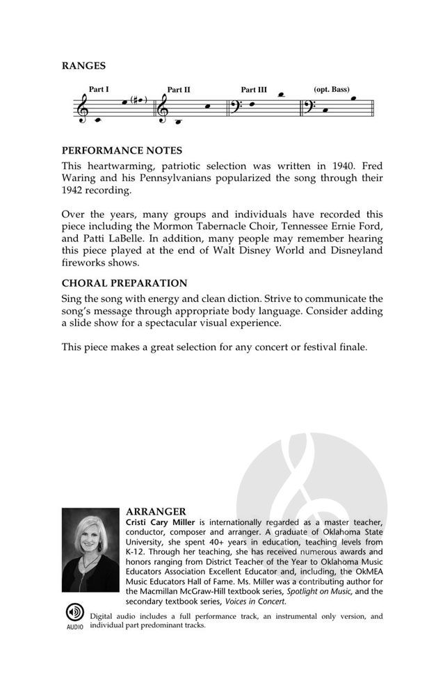 This familiar patriotic selection makes an excellent concert or festival finale. The 3-Part mixed arrangement includes optional bass notes that provide fuller vocals for developing choirs.