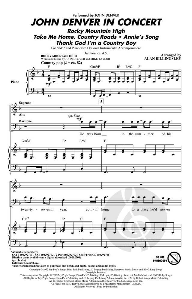 Four iconic songs--Rocky Mountain High, Take Me Home, Country Roads, Annie's Song, Thank God, I'm a Country Boy--by one of America's most famous pop artists of the '70s and '80s. These songs will reso...