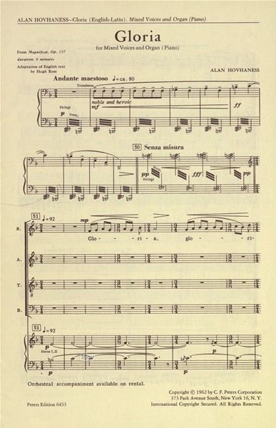 Hovhaness is primarily a minaturist, and although this is one of his more through-composed works, there are style nine distinct movements with pause. For Tenor solo, SATB chorus, Trumpet, Violin and s...