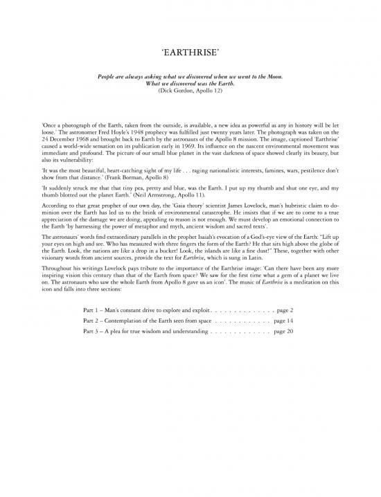 Ein Chorwerk, das von dem gleichnamigen Foto aus der Mondumlaufbahn von 1968 inspiriert ist und die positiven und negativen Seiten der Beherrschung der Welt durch den Menschen thematisiert. Das Werk w...