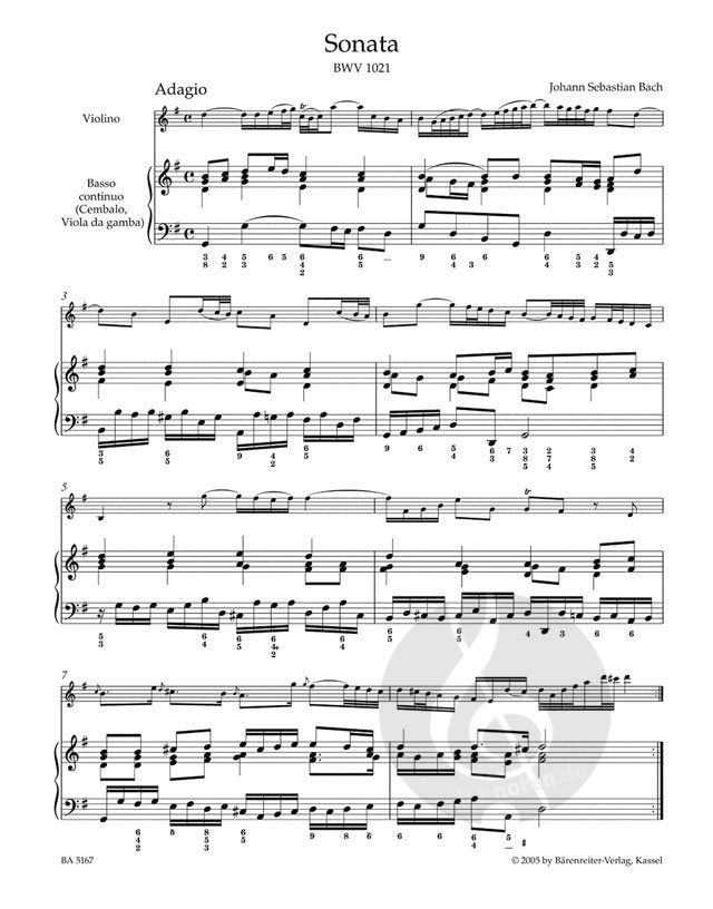 Urtext der Neuen Bach-Ausgabe - Sonata G major BWV 1021 and Sonata E minor BWV 1023. Violine, Basso continuo/ Cembalo/ Violoncello - Partitur; Stimmensatz; Urtextausgabe