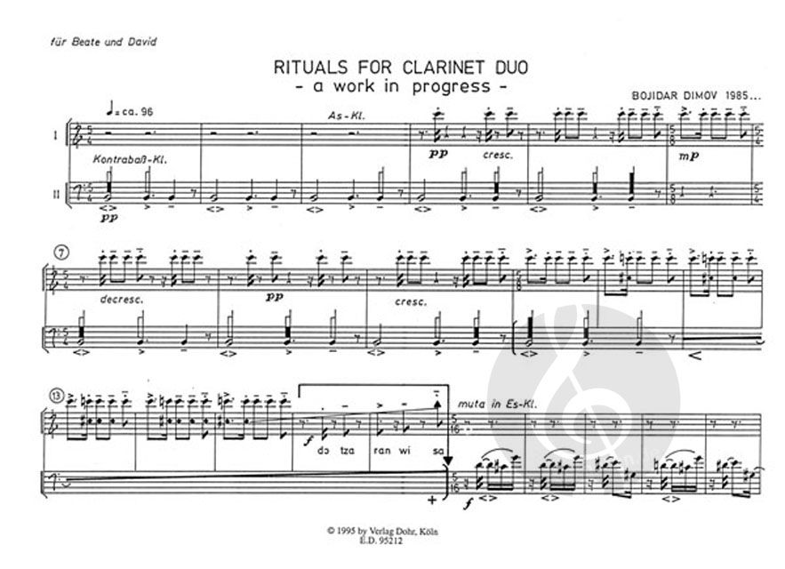 Klarinette, Bass-Klarinette in b, Klavier; Spielpartitur(en). Format: 34 S. - 29,7 x 21 cm.