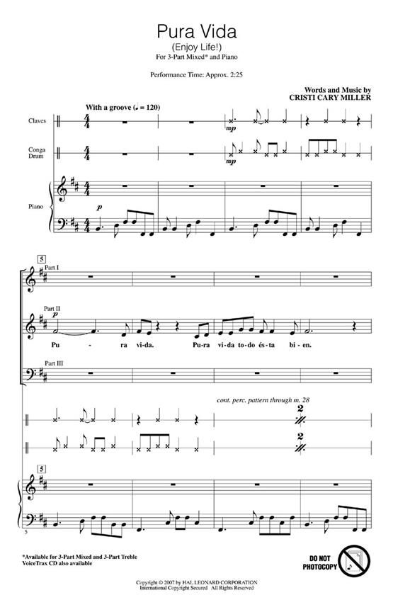 This Latin original is just brimming with energy! Rhythmic vocal lines are layered over an infectious groove to send a message to enjoy life! Level 1. Available for 3-Part Mixed, 3-Part Treble and Voi...