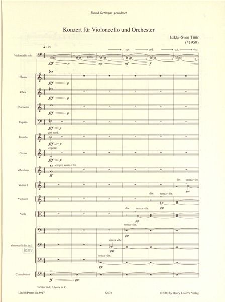 Cello, Flöte, Oboe, Klarinette, Fagott, Posaune, Horn, Vibraphon, 1. Violine (6), 2. Violine (5), Viola (4), Cello (3), Kontrabass (2)