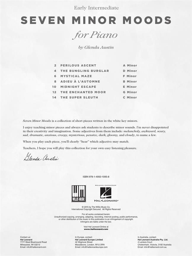Seven of the most melodic, charming waltzes you've ever heard! Austin succeeds in making each waltz a miniature gem destined to be a student and teacher favorite for years to come. Highly recommended.