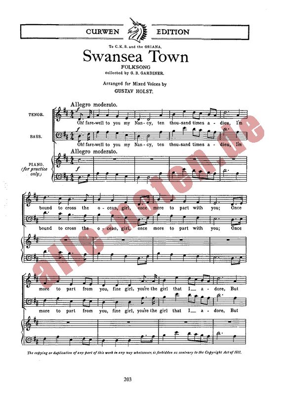 Swansea Town is a lively and spirited folksong which has been beautifully arranged for SATB by Gustav Holst. A Piano Accompaniment part is also scored for rehearsal purposes.