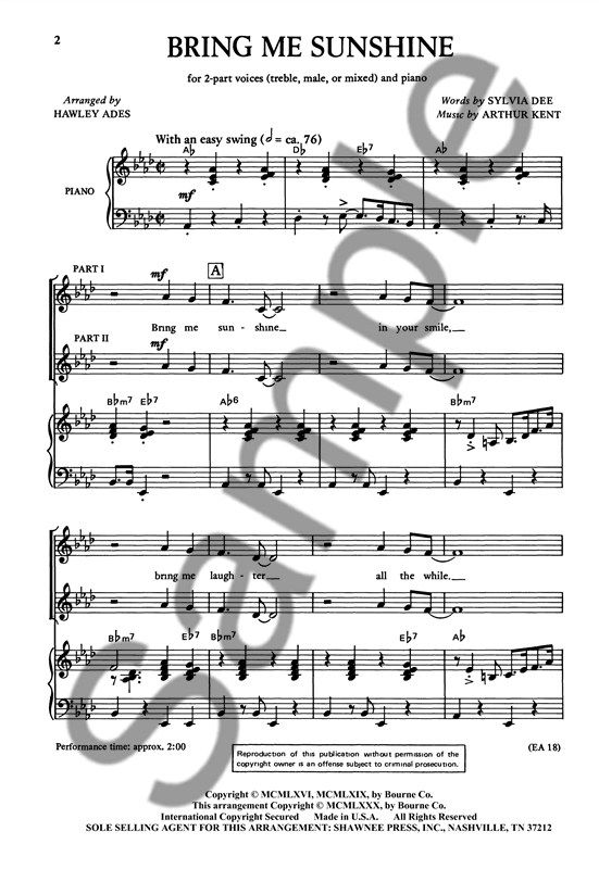 The unforgettable Bring Me Sunshine arranged for SA voices, ideal for school choirs.