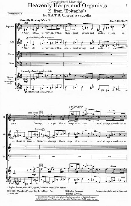SATB chorus. For SATB, Piano Rehearsal. Epitaphs for SATB Chorus, a cappella. Choral. Piano/Vocal Score. Composed 1993. 11 pages. Duration 4:15.