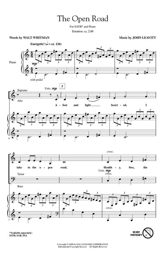 Taking its text from a Walt Whitman poem, this bold and compelling setting encourages the traveler to embrace life and the journey. An outstanding selection for festival or competition use!