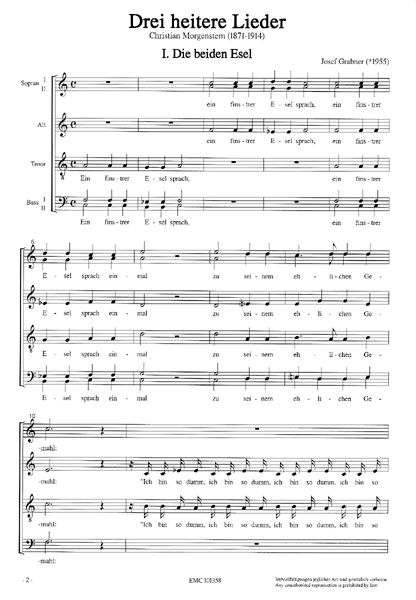 Besetzung: SATB Zyklus: 1. Die beiden Esel, 2. Das Mondschaf, 3. Das aesthetische Wiesel; Text: Christian Morgenstern (1871-1914)