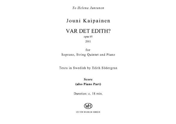 Jouni Kaipainen's Var Det Edith? Op. 95 (2011) for Soprano, String Quintet and Piano. Texts in Swedish by Edith Södergran. Composed for the soprano Helena Juntunen.