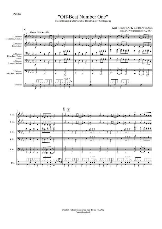 Inhalt / Besetzung: 1. Stimme in Bb und C, 2. Stimme in Bb und C, 3. Stimme in Bb, C, Eb und F, 4.Stimme in Bb und C, C-tief, Drumset, Partitur in C.